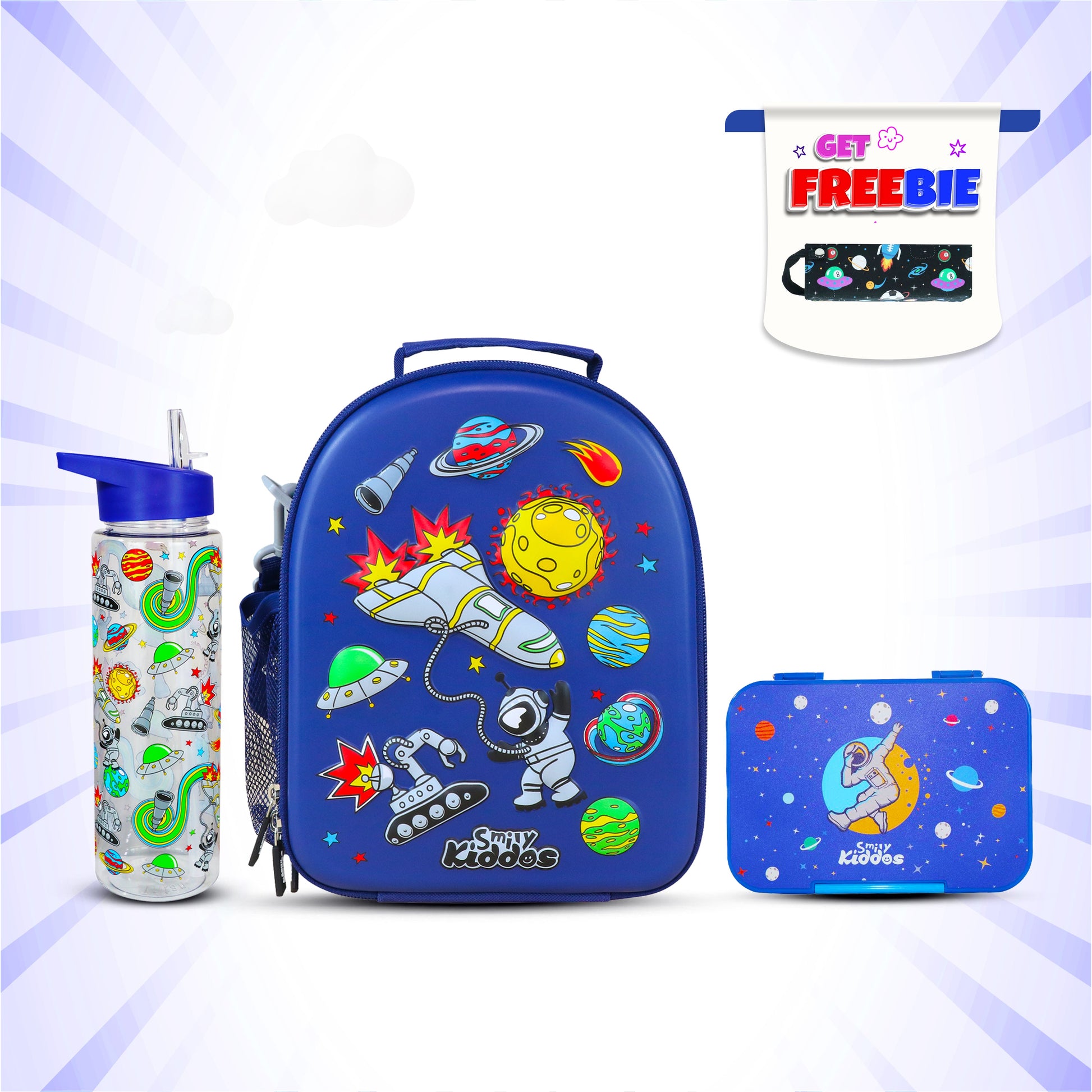 Space Theme Lunch Combo 3-in-1 Pack (Lunch Bag, Lunch Box & Water Bottle) - Blue